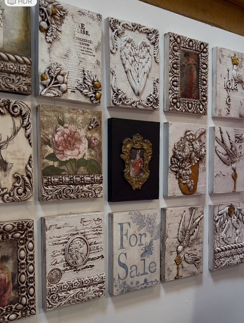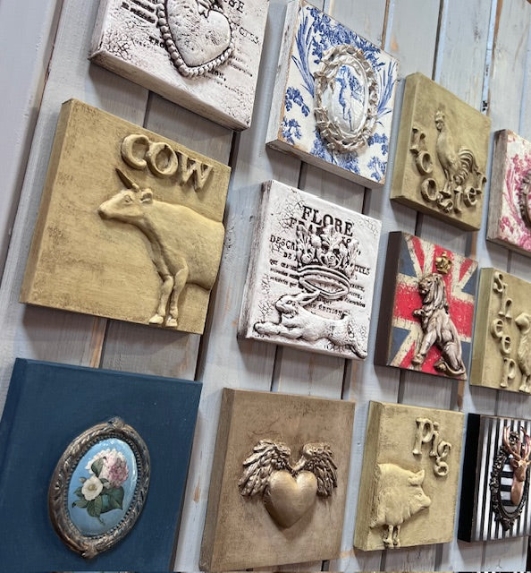 The base material of tile is wood which depending upon the design can be layered with air dry clay, resin, decoupage paper, paint and then finished accordingly.